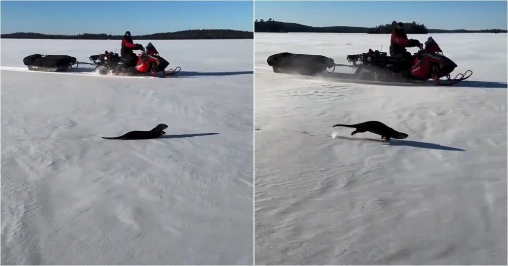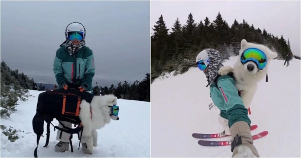 Для поездок у питомца есть целый комплект экипировки: специальный рюкзак, защитные очки и максимально довольное выражение морды. Вместе они катаются на склонах, собирая много внимания.