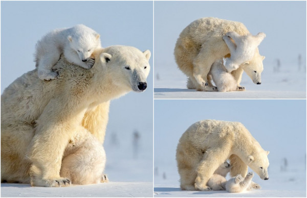Прелестный белый медвежонок был запечатлен падающим со своей мамы в снег. Падение трехмесячного детеныша стало неожиданностью для его брата, когда они играли и карабкались по матери, изучая ценные уроки выживания. Фотограф Хун Цуй (Hung Tsui) запечатлел трогательную встречу между семейством белых медведей в Национальном парке Вапуск, Канада.