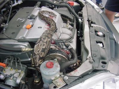 Мужик, едущий по трассе 144 из Сант-Люиса (СЩА, Минессота), почуствовал, что тачка не идет так, как обычно. Остановившись пофтыкать в чем дело и открыв капот, он убедился, что стал счастливым обладателем питона, имплантированного в его тачку. Впрочем, убедитесь сами.
