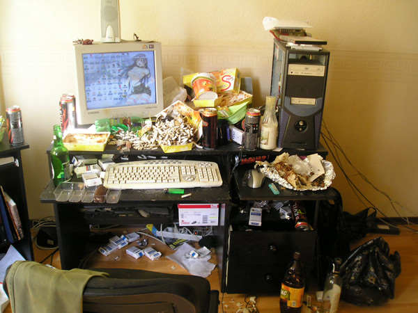 Сосед, Вовчик, программист. Холостяк, поэтому я сразу была готова к тому, что в комнате у него, наверняка, разбросаны вещи, может быть, стоят невымытые тарелки. Так что слова - "У него там такой ужас", я не принимала всерьёз. Всё время твердила, что я ничем не лучше, особенно мой рабочий стол. Сейчас, когда мама в деревне, он представляет из себя склад с наиболее часто употребляемыми вещами.