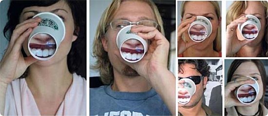 Реклама жевачки Риглис. Выглядит, конечно, страшно. Акция, совместная с кофе-хаусом Старбакс. В общем, любитель кофе убирает чашку, а таммм...