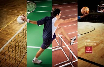 Сотдруники из рекламного агентства Neogama/BBH представили "олимпийскую" серию рекламных принтов для бразильского инвестиционного банка Bradesco, в которой сравнили финансовый бизнес с Олимпиадой. Слоган рекламной кампании гласит : Olympics: like the financial business, to succeed you need to have a lot of skills.