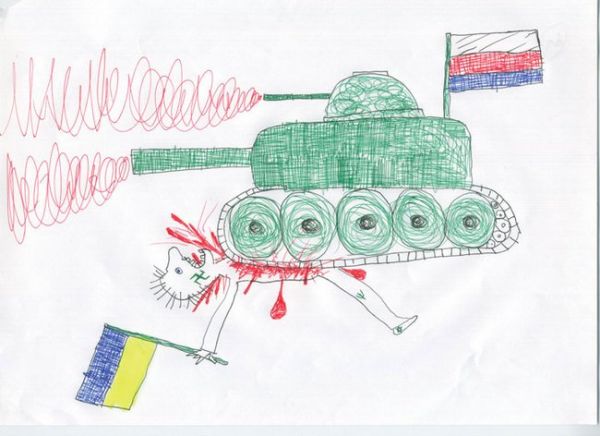 Русский танк давит украинского наёмника Пётр Ткаченко, 5 классПётр написал нам смс по телефону: "TYT HAW TAHK ZADAVIL BAHDEROVSA JAKIY GADIL ROSSII I OSETEI"
