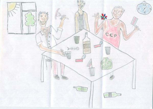 Папа с другими дядями празднует победу над грузинами Лёша и Мариша Куевда, 8 и 10 лет, г.ЯсиноватаяЛёша нам написал такое: "Папа очень обрадованный и другие дяди тоже очень обрадованные. Потому что наши победили непослушных грузинов и всех других плохих. Все очень радые. А Маринка наресовала только цветочек а я всё остальное"