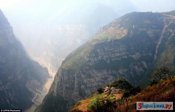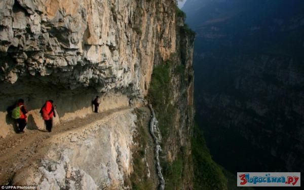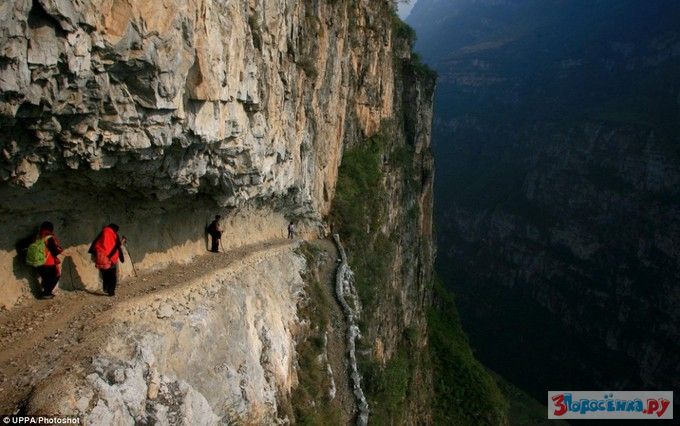 Жители деревни Gulucan (Западный Китай) каждый день рискуют жизнью, отводя детей в школу. Дело в том, что единственный к ней путь - узкая тропинка, вырезанная в 5000-футовом утесе.
