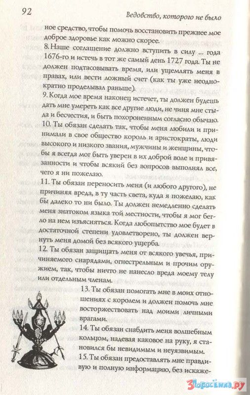 Отрывок взят из сборника статей Р.Х. Робинса "ВЕДОВСТВО, которого не было". Сей договор возможно был заключен между дьяволом и неким джентльменом из Пиньероля 1676 г. Но скорее всего бедняге пришлось придумывать все на ходу во время пыток. А так - забавно читать. Никаких просьб - только жесткие условия.