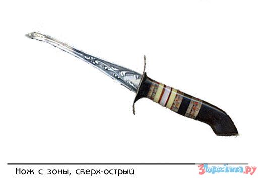 Только на "зоне" мастер может годами работать над одним-единственным ножом, оттачивая его и постепенно доводя до совершенства. Ножи, сделанные в "зоне", не покупаются и не продаются, они хранятся недоступными для посторонних глаз, ибо того требует кодекс "зоны". Однако время от времени каким-то образом один из таких ножей попадает в руки обычного человека. Помимо совершенства форм нож, изготовленный на "зоне", имеет важное преимущество перед другими ножами - его острота не знает себе равных, а сам он никогда не тупится