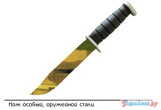 Самым лучшим из возможных вариантов стали для клинка является "оружейная" сталь. Об этом знает практически каждый, хотя ножи, изготовленные из знаменитой оружейной стали, исчисляются едва ли не единицами. Это объясняется тем, что процесс изготовления ножа из этой стали чрезвычайно трудоемок и кропотлив, а секрет его по настоящий день считается утраченным. Мастерством получения знаменитой оружейной стали обладают только советские прапорщики. Передавая этот секрет из поколения в поколение, они достигли невероятных высот. Древние летописи и записи о взысканиях позволяют нам немного приоткрыть завесу этого древнего таинственного ритуала.