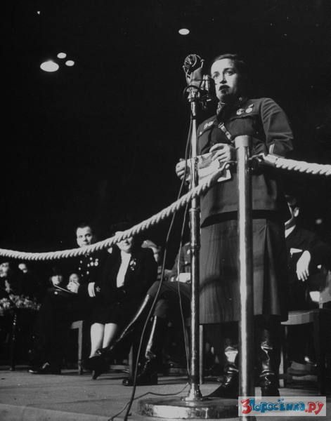 Людмила Павличенко - Герой Советского союза, награждена двумя орденами Ленина, один из самых результативных снайперов времен II Мировой войны. На ее счету 309 подтвержденных попаданий, в том числе по 36 гитлеровским снайперам. В 42 г. была ранена и, после выписки из госпиталя, отправлена в турне по Канаде, США и Великобритании.