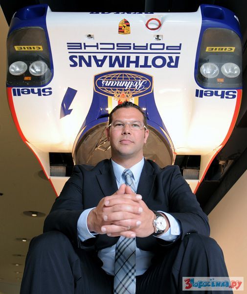 Директор музея Porsche Achim Stejskal и модель гоночного автомобиляPorsche 956 Porsche 956, сделанного по аэродинамической концепции Формулы-1.