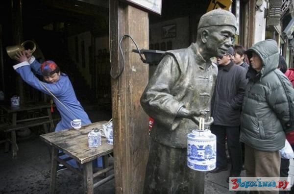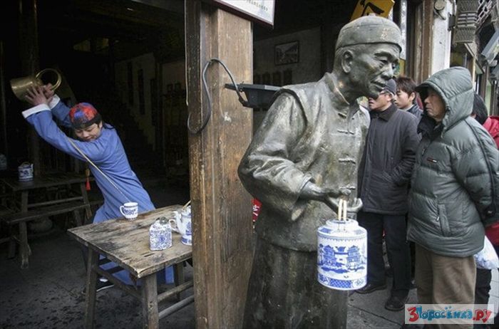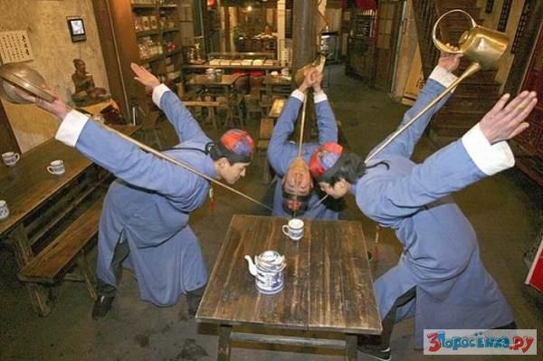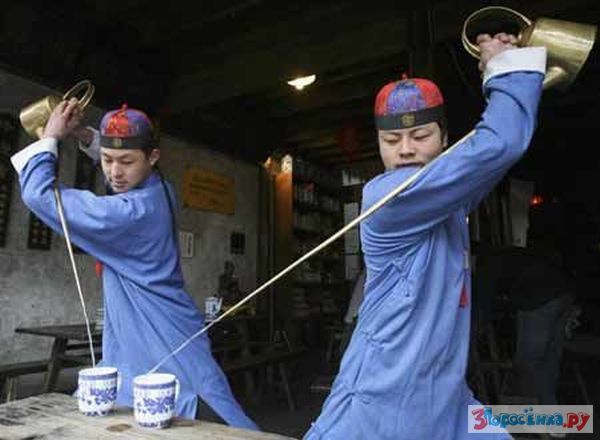 Видел я таких виртуозов в поднебесной,когда особенно из-за плеча или сбоку наливают, срабатывает рефлекс подскочить, а то обольют.