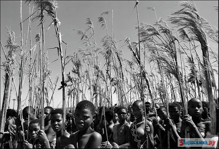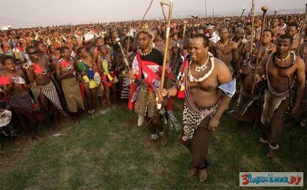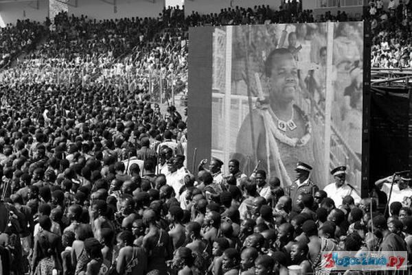 Королевство Свазиленд - государство бедное, но спокойное. Причина и того и другого кроется в том, что у госудраства нет никаких полезных ископаемых. Поэтому оно не представляет никакого интереса для сверхдержав - никто не спонсирует там оппозицию и не проводит революции. Единственная богатая прослойка - это родственники короля и его придворные, а также военные. Каждый год в стране проходи праздник тростника. Именно тогда король и выбирает себе новую жену. Она обязательно должна быть девственницой. У отца короля было 70 жен и примерно 600 детей. А вот сам король выбирает пока 14-ю жену. 13-я оказалась неудачным выбором. После женитьбы оказалось, что новая жена - несовершеннолетняя. По стране поползли слухи, спикер парламента начал критиковать короля, начала появляться оппозиция. Король оказался мудрым и сделал несколько простых ходов - сначала по смс он уволил спикера парламента, а потом сам себя судил и приговорил к штрафу в одну корову. Все остались довольны. Ну, а теперь давайте посмотрим фотографии. 60 000 полуголых девственниц в одном месте! Вы никогда такого не видели.