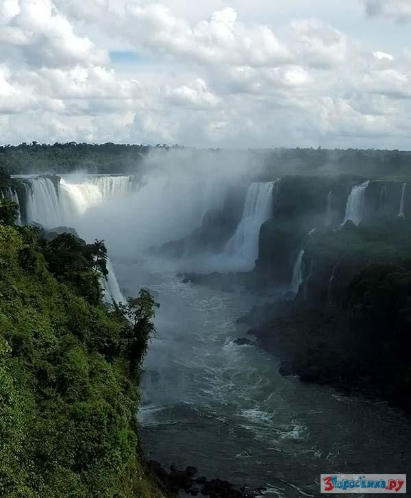 "Глотка Дьявола" - так называется самый крупный из 270 водопадов реки Игуасу на границе Бразилии и Аргентины. Индейцы говорят, что Игуасу - творение разгневанного бога Мбоя. Он пришел в ярость, когда узнал, что его невеста бежала с простым смертным. Пытаясь скрыться, беглецы сели в лодку и стали спускаться вниз по Игуасу. Погнавшись за ними, Мбоя обрушил дно реки, отчего и получилось столько провалов с падающей вниз водой. Влюбленные упали вниз с огромной высоты. По легенде, девушка превратилась в скалу, а ее возлюбленный - в пальму на берегу.