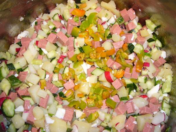 Пока варяцца картошка и яйца, режем кубеками колбасу.