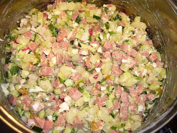 http://udaff.com/fzr/99269.htmlПС. Ну, не считая, острого перца, вполне традиционное фкусное блюдо безо всяких выибонофф (ну, не считая, острого перца). В принцыпе возможны минимальные вариации: мясо вареное - вместо колбасы или вместе с колбасой, вместо горчицы - хрен, ну, ещо зелени разной добавить - питрушки, кинзы, мяты...