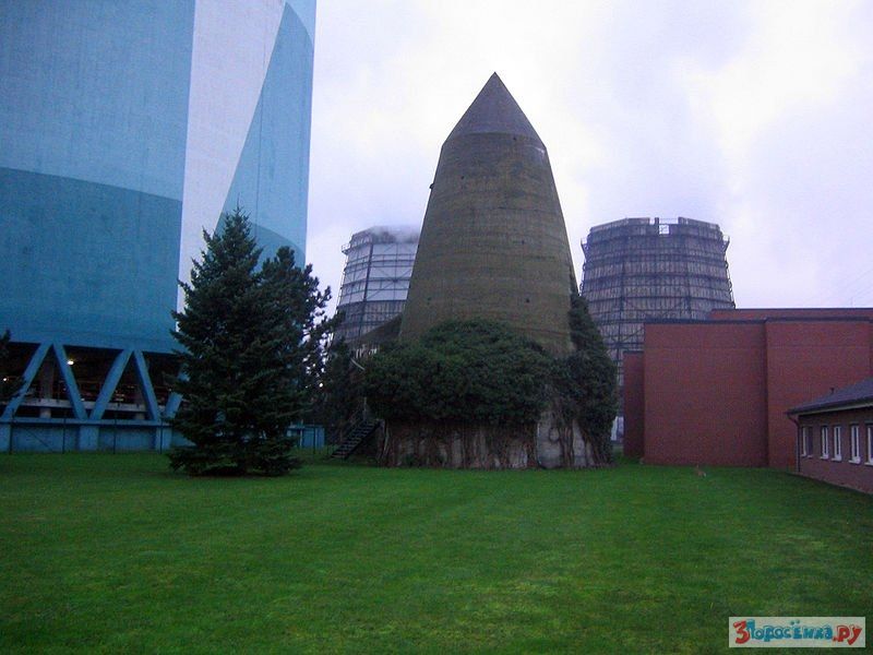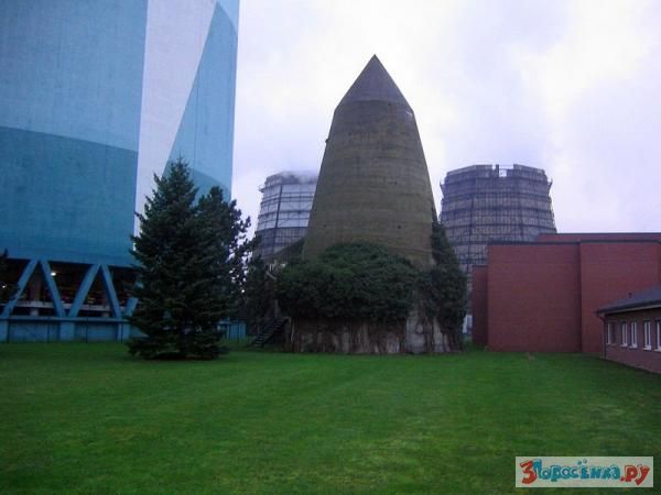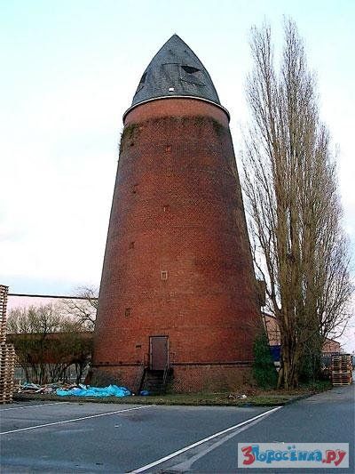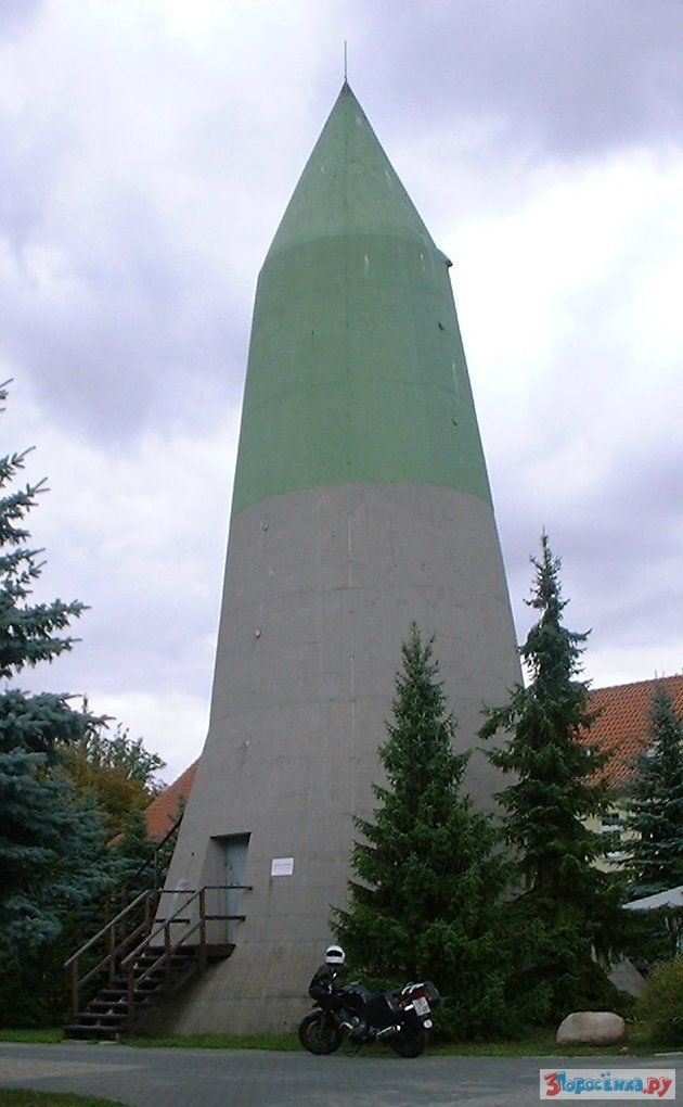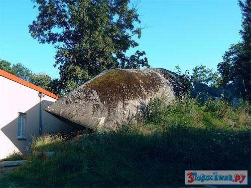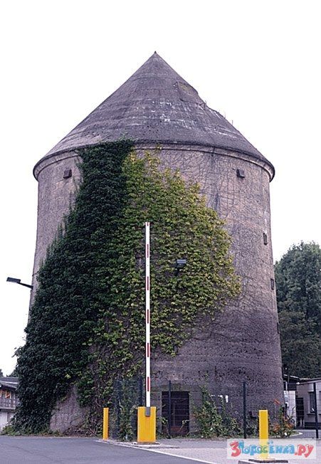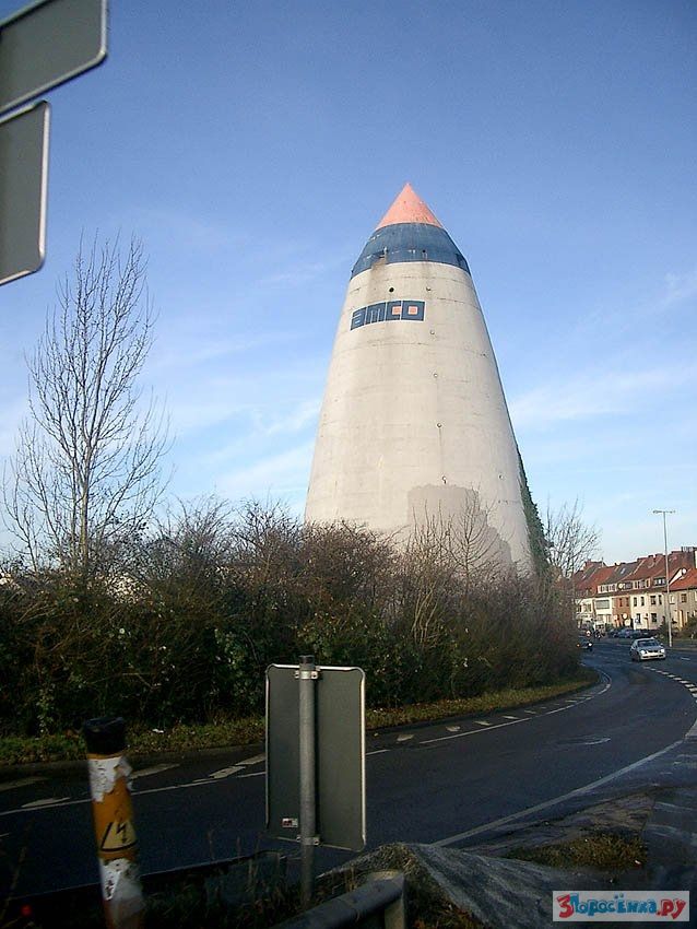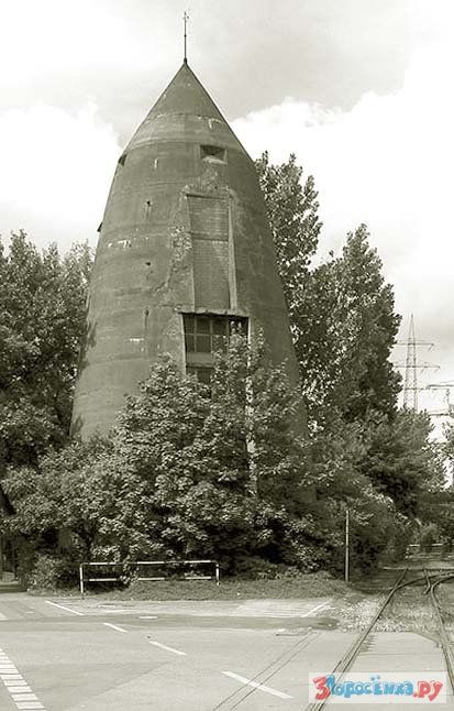 Как вы думаете что это? Водонапорная башня? Нет, это бомбоубежище, смысл такого дизайна состоит в следующем: бомба падает на эту конструкцию и не пробив крышу, скатывается по стенам к массивному основанию, которое выдерживает взрыв. В такую конструкцию еще надо попасть, пилоты видят бомбоубежище, как пятно.