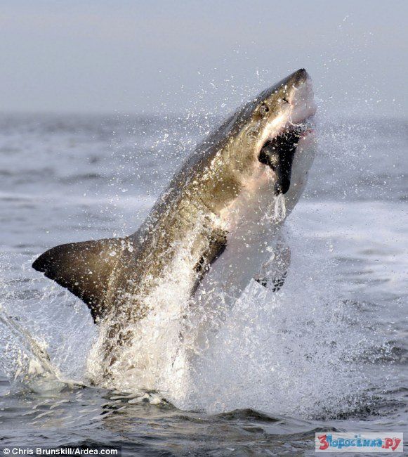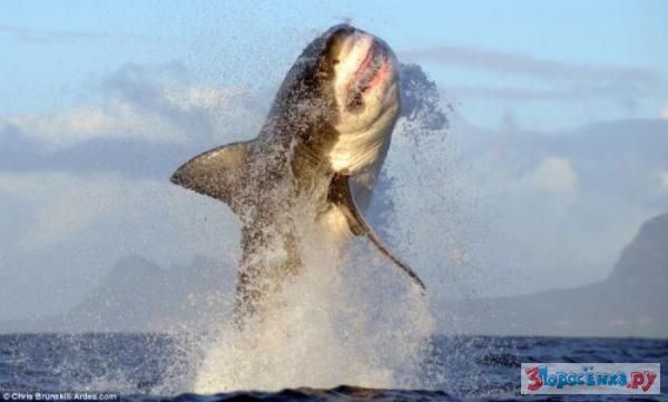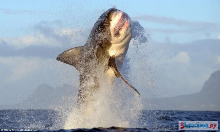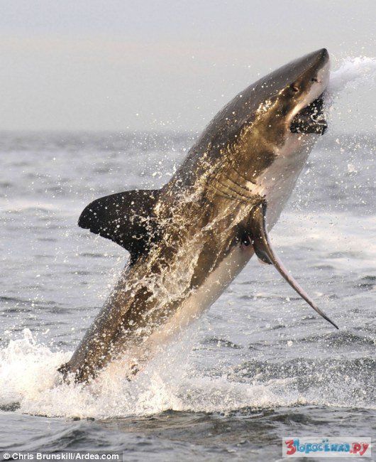 Полет белой акулы, атаковавшей жертву снизу.