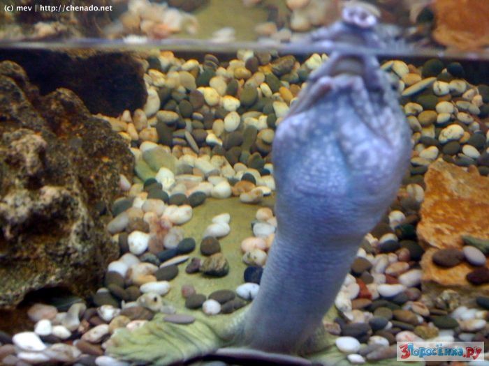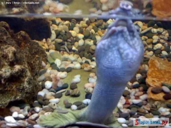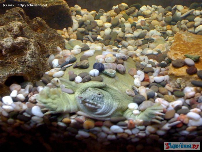 Называется это чудо Pelodiscus sinensis (Трионикс Китайский\Дальневосточная\Китайская мягкотелая). Это оказывается черепаха, никогда бы не подумал. Панцирь их достигает до 25см в длину, покрыт сверху и снизу мягкой кожей без роговых пластин. Сверху черепаха окрашена в зеленовато-бурый цвет с редкими желтоватыми пятнышками. Нижняя сторона ее тела розовато-беловатая или желтоватая. Вес черепахи достигает нескольких килограммов.
