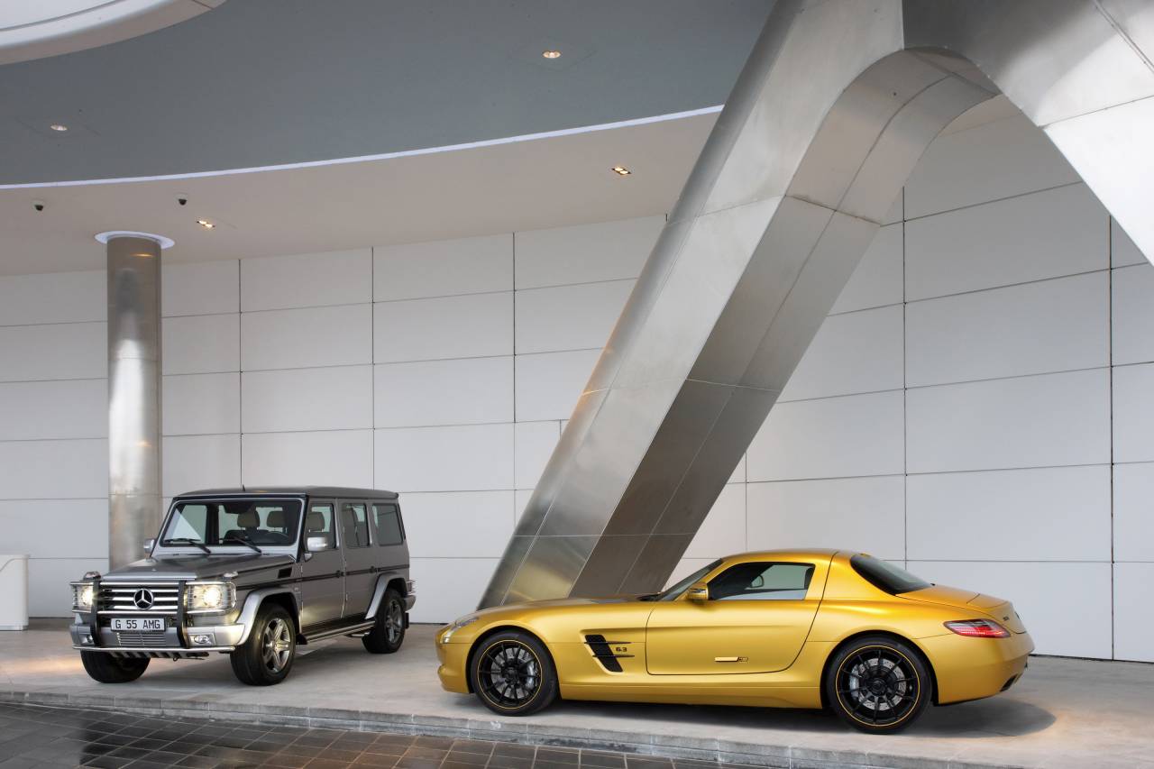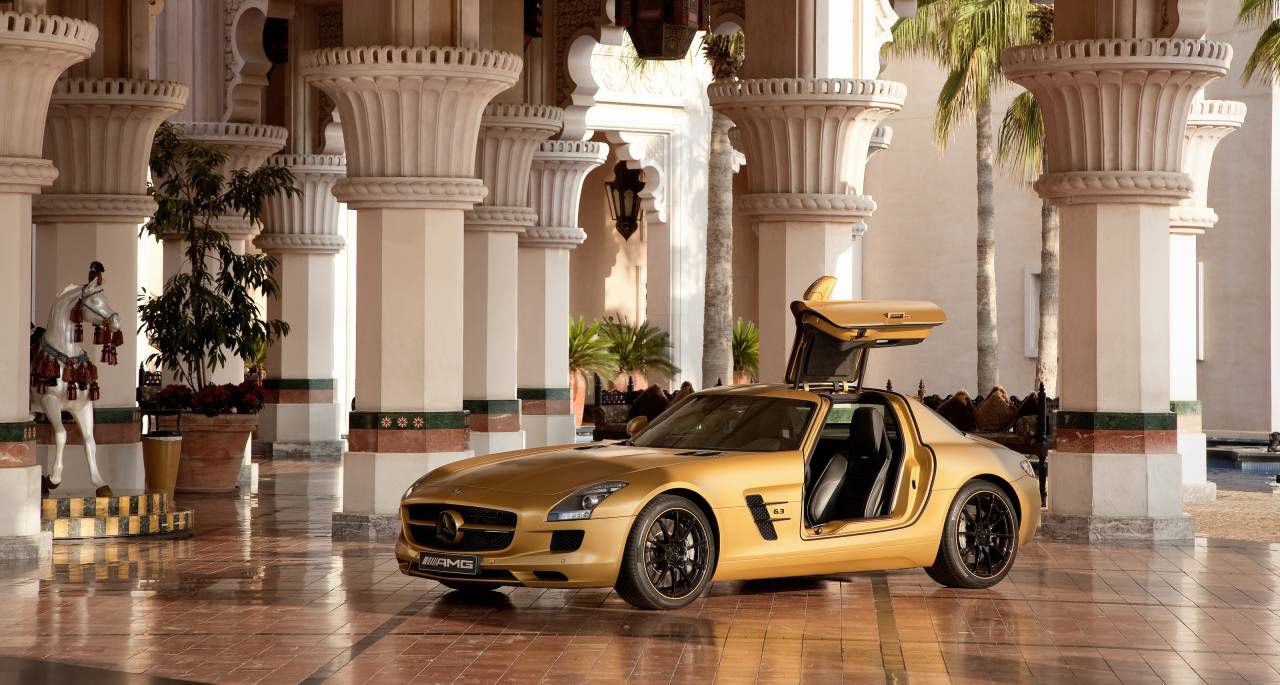 Давно уже никого не удивляет, что в ОАЭ богатые принцы и шейхи предпочитают окрашивать свои суперкары в золотой и хромированные цвета с инкрустацией алмазами. В преддверии юбилейного десятого автошоу в Дубае (Dubai Motor Show 2009, пройдет с 15 по 20 декабря) компания Mercedes-Benz подготовила свой новейший суперкар SLS в специальной версии для ОАЭ под названием Mercedes-Benz SLS AMG Desert Gold.