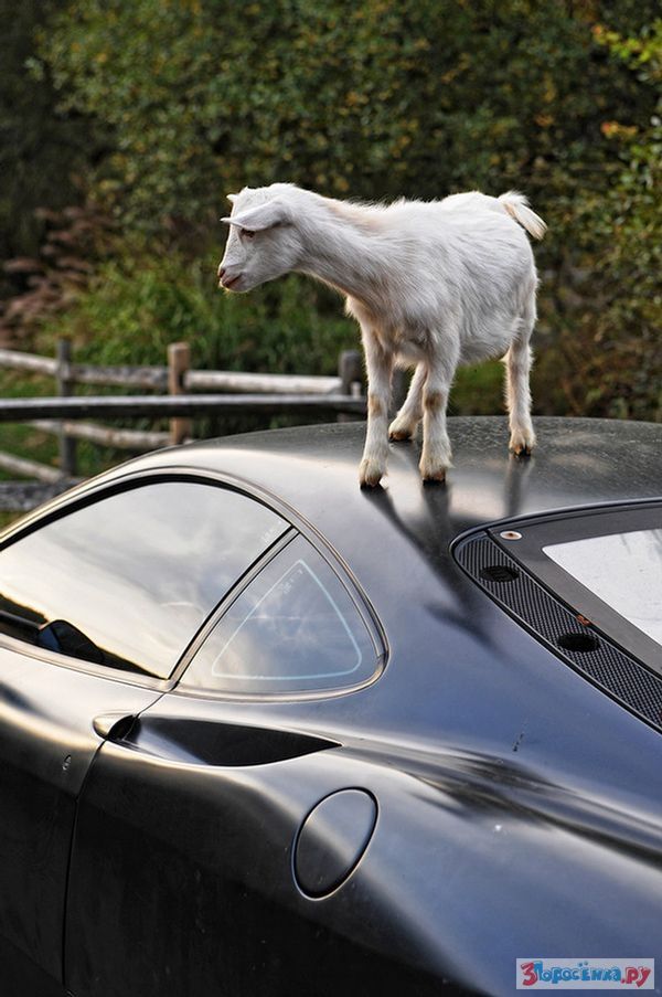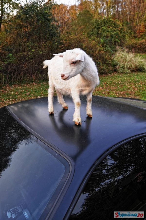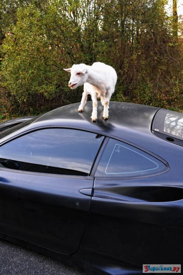 видно же что его туда сами посадите, вы мозжечками то пошевелите раз в жизни, как козлик может на машину залезти? Копыта скользят по металлу. И на всех снимках он потеряный, это как кота на шкаф посадить и он в апнике будет по сторонам зырить и думать как слезти:sm0012:
