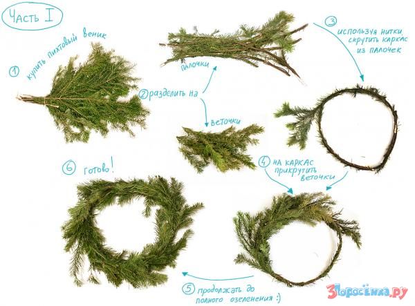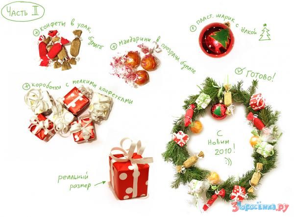 Близится 2010-й год. Вроде как круглая дата. Значит давайте и елку сделаем круглую! )) "Круглая ёлка" - новогодний венок-украшение для дома. Также его можно подарить родным или друзьям. Для его изготовления используются настоящие пихтовые ветки, это сразу создает атмосферу нового года. А все украшения - съедобные.