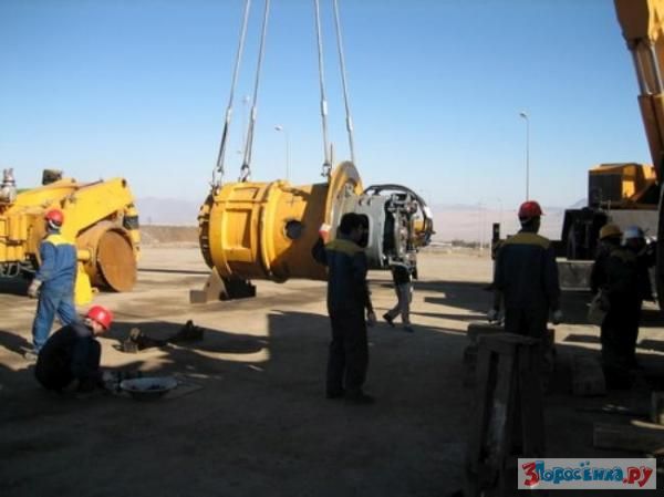 В карьере под руководством специалистов с завода машину собирают снова. К раме с уже установленным двигателем и генератором крепят задние мотор-колёса.