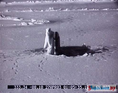 Подводная лодка всплыла на севере и к ней нагрянул гость с проверкой. Где и был сфотографирован, судя по всему, через перископ.