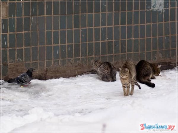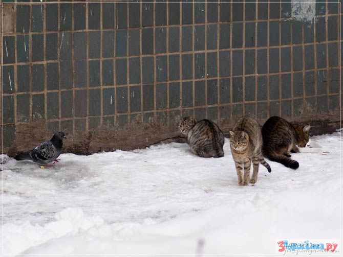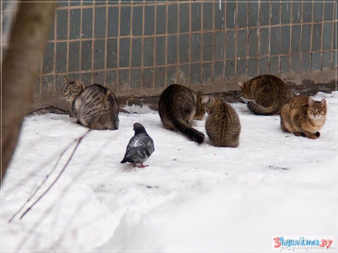 Более наглую птицу еще нужно поискать. Небольшая тусовка кошек/котов, хвостов в пять-шесть, мирно полдничает чем бог послал в местах кормления добрыми бабушками, как вдруг из-за угла, вразвалочку, подходит это чудо в перьях и происходит буквально следующий диалог: