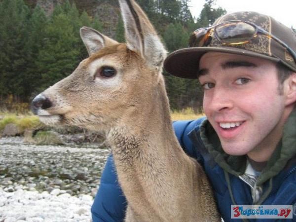 Мужики приехали в глухое место водки попить рыбки половить, как вдруг к ним неспеша подходит... олененок. Самый настоящий. Может от родительницы отбился, а может просто настолько глухие места, что животные непуганые совсем )) Так что вместо рыбалки устроили фотосессию ))
