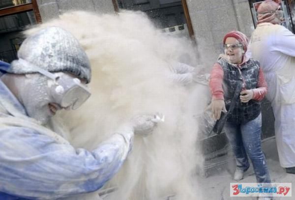 Происхождение этого шутливого боя мукой, зародилось в Северной Испании во время карнавала.