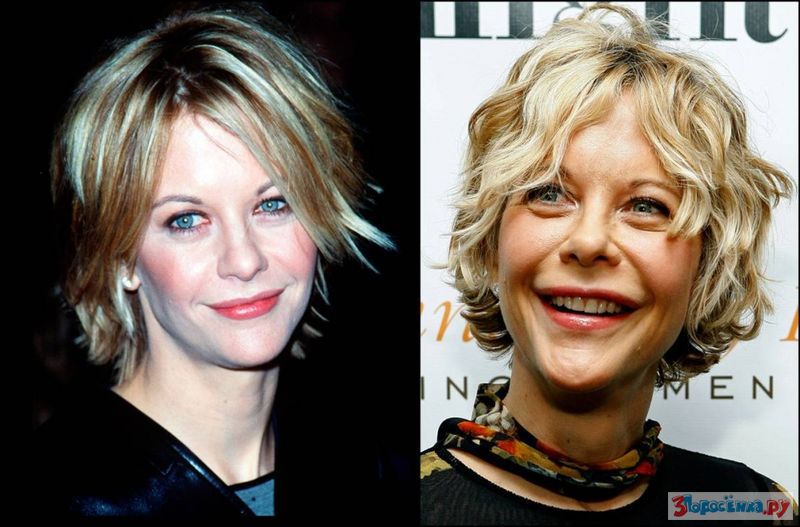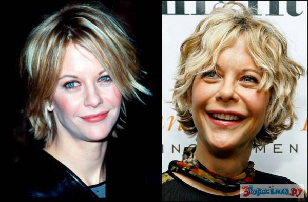 Американская любимица стала почти неузнаваема за последние несколько лет. Губы Мег райан выглядят слишком раздутыми. Думаю, в них поместили имплантаты, например, Gortex. Это вещество может сделать губы слишком большими, натянутыми и неестественными. Обычно его впрыскивают малыми дозами. Также она, похоже, не побрезговала имплантатами щек, из-за чего она выглядит теперь немного "разбухшей". Хорошо, что эти имплантаты полностью заменяемы во время 20-минутной операции. Если она действительно хочет естественные губы, я бы порекомендовал, чтобы она убрала имплантаты и воспользовалась жиром.