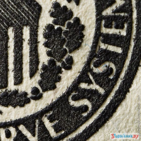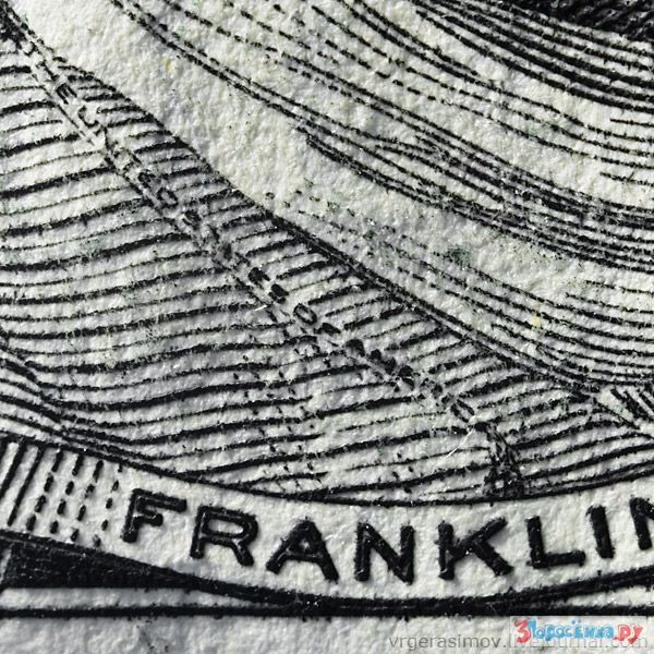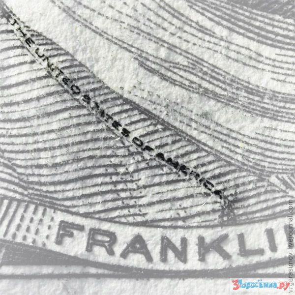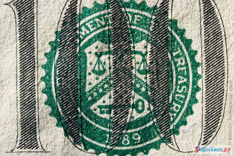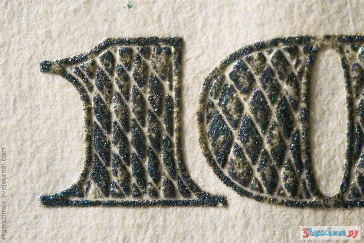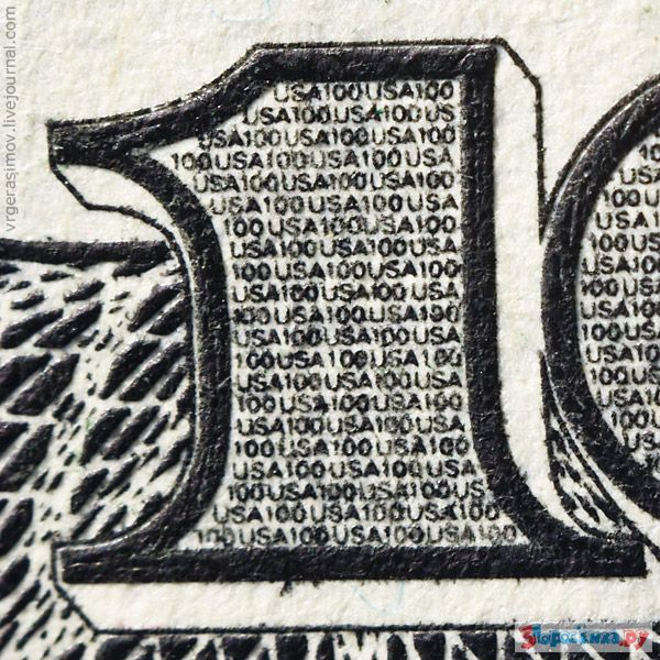 Из примечательного, что не видно невооруженным глазом, первое найденное мною это микротекст USA100 внутри символов номинала в левом нижнем углу: