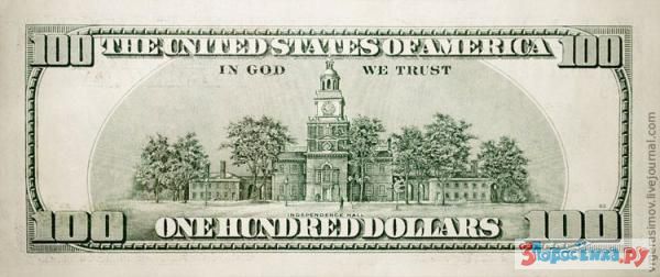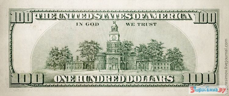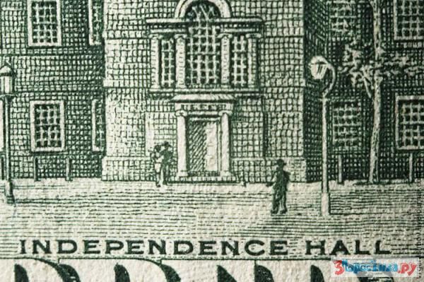 На другой стороне купюр помещены изображения, иллюстрирующие историю США. На 100 долларах это Индепенденс-холл, находящийся в Филадельфии -- здание, в котором была подписана Декларация Независимости: