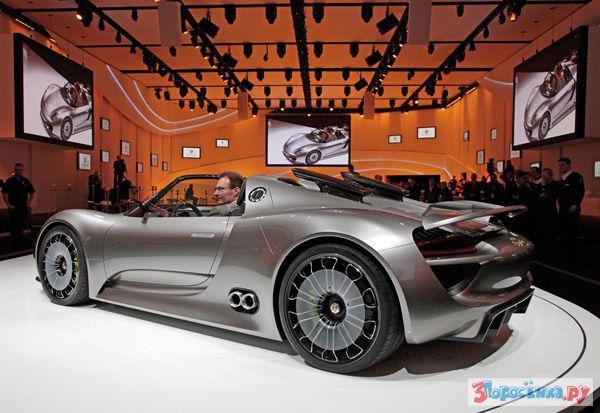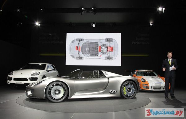 Компания Porsche представила на автосалоне в Женеве концепт спорткара 918 Spyder. Автомобиль построен на платформе гоночного спайдера Porsche RS и оснащен гибридной силовой установкой, сочетающей в себе 500-сильный атмосферный двигатель V8 объемом 3,4 литра, два электромотора суммарной мощностью 218 лошадиных сил и семиступенчатый "робот" с двумя сцеплениями. На электротяге спорткар может проехать около 25 километров. Батареи силовой установки могут подзаряжаться от бытовой электросети. С 0 до 100 км этот красавец может разогнаться за 3,2 секунды. Максимальная скорость составляет 320 километров в час. На конвейер серийный 918 Spyder, возможно, встанет через пять лет.