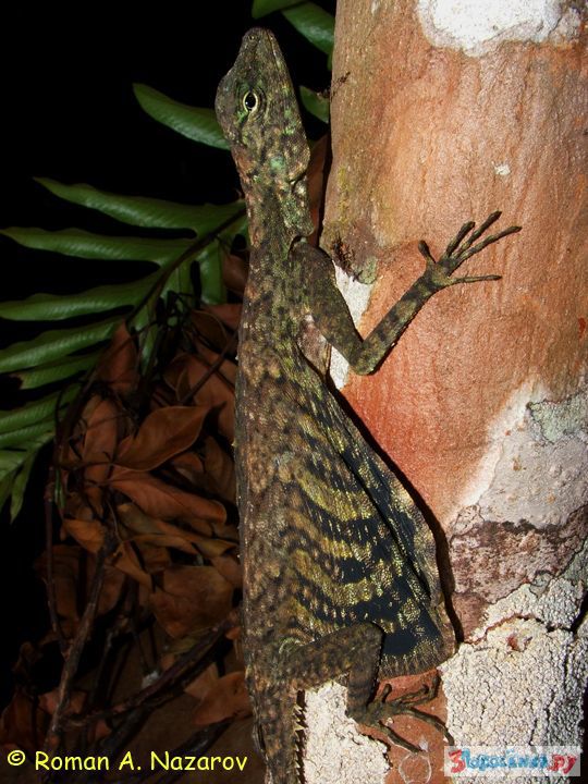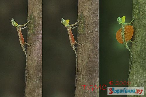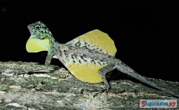 АГАМА ЛЕТУЧИЙ ДРАКОН способна планировать, убегая от хищника, расправив кожистые складки по бокам туловища, как белка-летяга, поддерживаемые длинными ложными ребрами.
