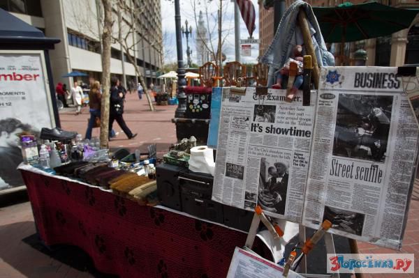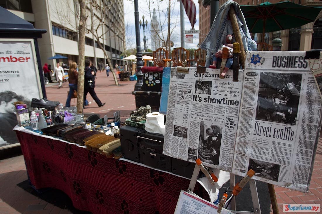 Рядом с щетками и ваксой стоит стенд с доказательствами крутизны хозяина точки - вырезки из местных газет с рассказами о нём. Увидев у меня в руках фотоаппарат, чистильщик бросил клиента и подошел ко мне, выразительно потирая пальцы - гони, дескать, монету. Запросил двадцатку. Штирлиц укоризненно посмотрел на него. Достопримечательность поубавила пыл - сошлись на пяти.