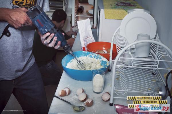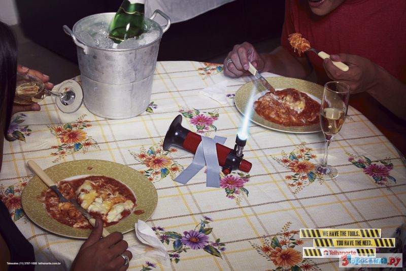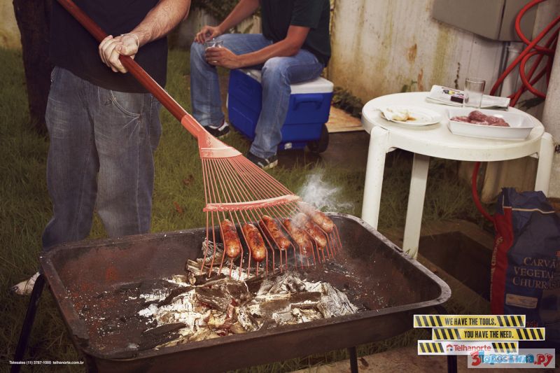 Реклама хозяйственных инструментов на кулинарную тематику со слоганом: "Telhanorte - У вас есть потребности, у нас - инструменты для их удовлетворения"