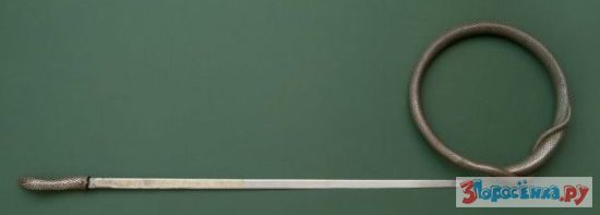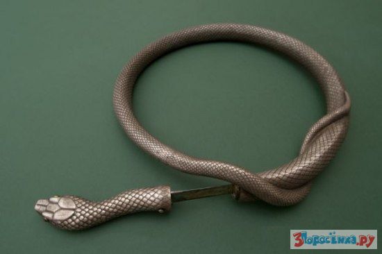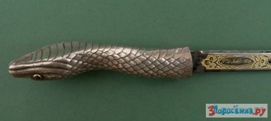 Серебряная голова ядовитой змеи и начало туловища - рукоять. У змеи глаза-вставки из розового стекла. В рукояти вмонтирована пружинная защелка, фиксирующая клинок в ножнах.