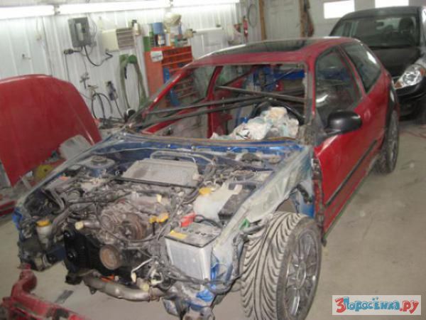 7-летний Yannik ездил на HondaCivic, но мечтал всегда только о СубаруWRX. Так как денег у него не хватало на желаемый авто, он придумал хитрый ход. Купил сильно разбитую WRX.. меньше чем за 2000 канадских долларов и поставил на неё кузов от своего Civic, пускай машинка не выглядит так как хотелось бы ему, но главное ведь содержание.. Итого прайс на его "Hondabaru" составил около 5100 канадских долл.