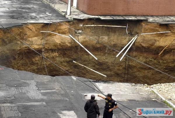 В Гватемале в столице страны в результате оползня образовалась гигантская воронка, которая в буквальном смысле слова поглотила трехэтажное строение и небольшой жилой дом. По некоторым данным, в результате разрушения этих зданий погиб один человек. Однако официальные лица эту информацию не подтверждают.