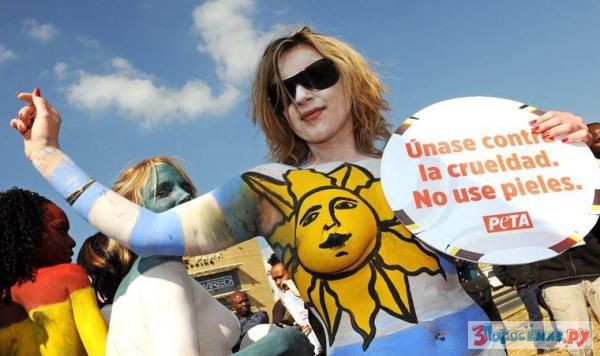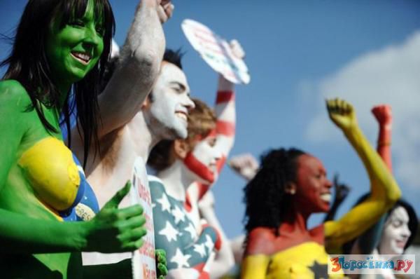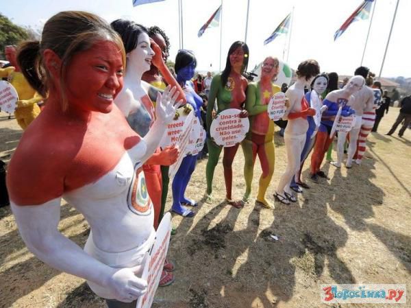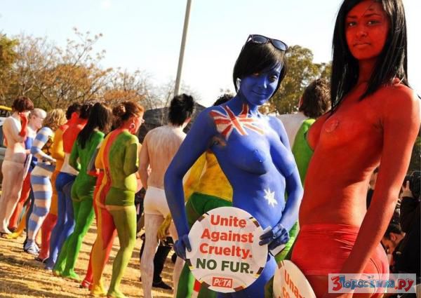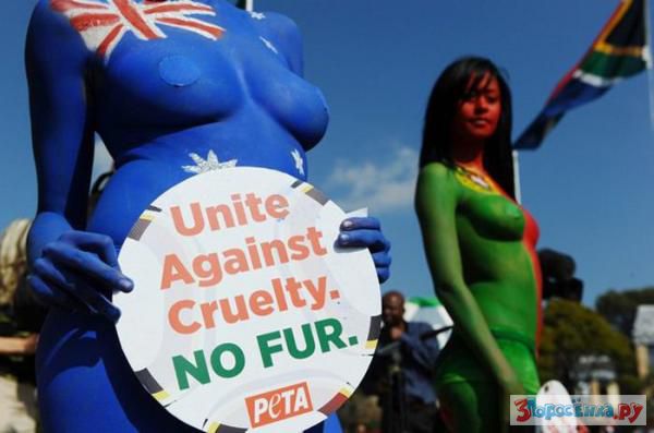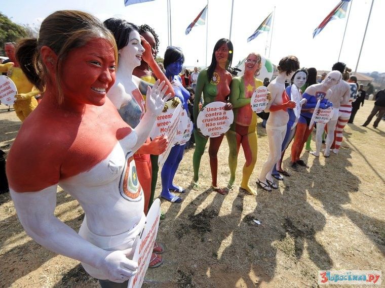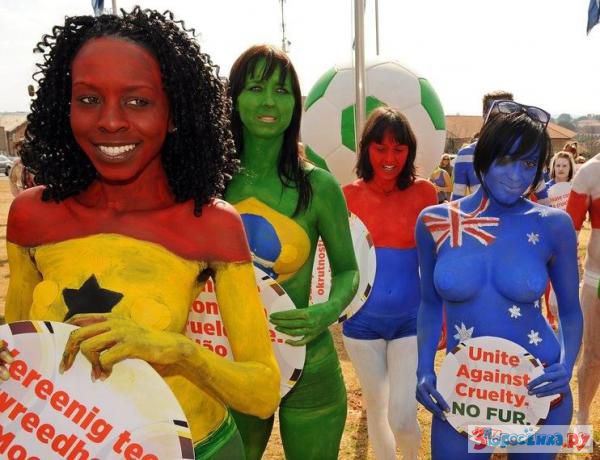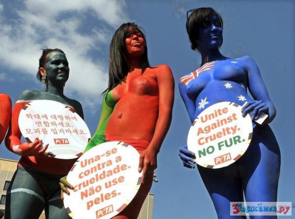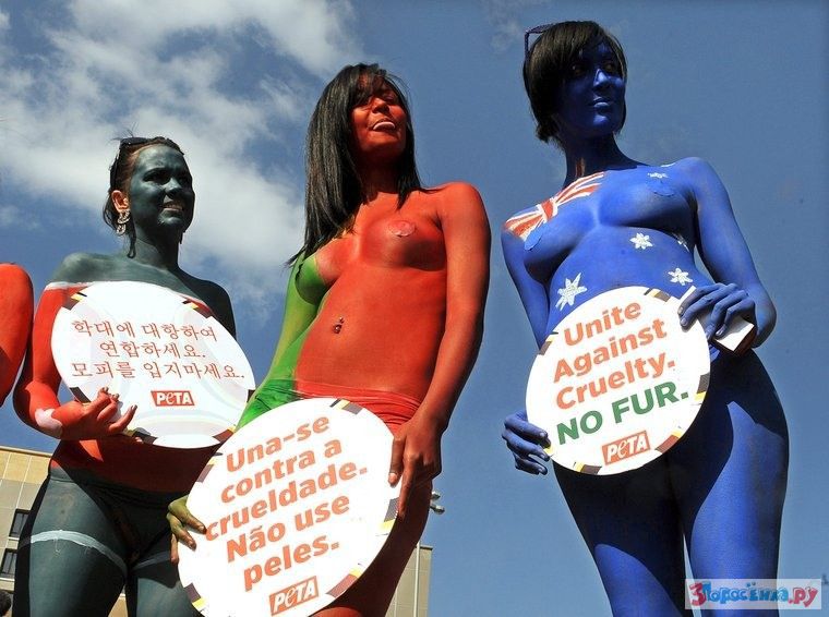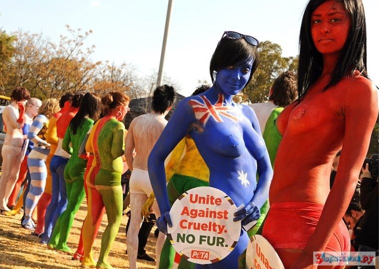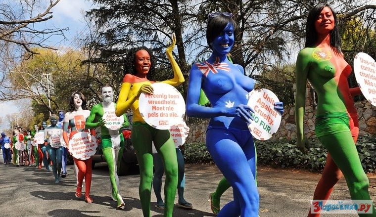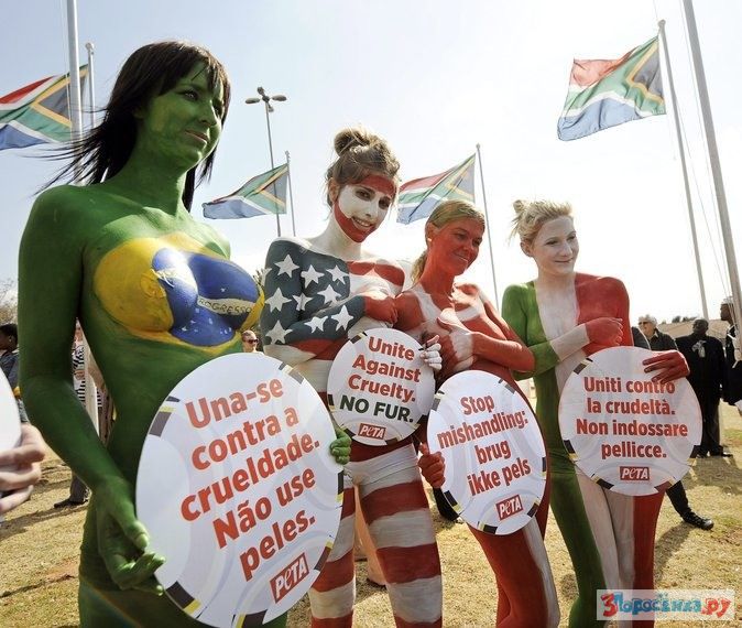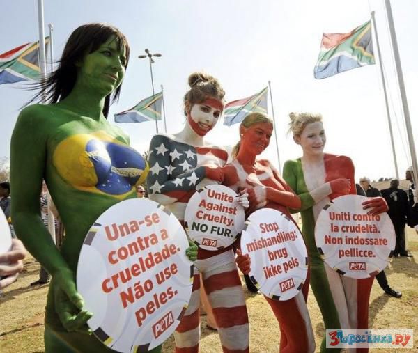 В преддверии финала Чемпионата Мира по футболу активисты РЕТА (People for the Ethical Treatment of Animals) разрисовали свои тела в национальные флаги стран-участниц ЧМ и устроили протест в богатом районе Йоханнесбурга. Демонстранты традиционно требовали отказаться от одежды и аксессуаров из натурального меха. Украинскому движению похожего толка Femen пора удавится - во-первых, активисткам РЕТА таки есть, что показать, во-вторых, протестовать в Африке против меха это круче, чем требовать голыми сиськами от президента Украины не притеснять конституцию.