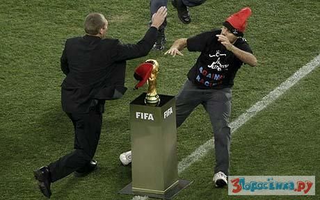 На церемонии награждения чемпионата мира по футболу вновь напомнил о себе Джимми Джамп, он попытался надеть красную шапку на самый ценный футбольный трофей в мире!