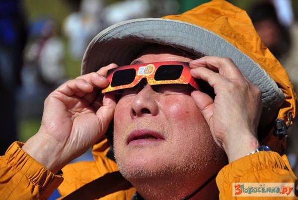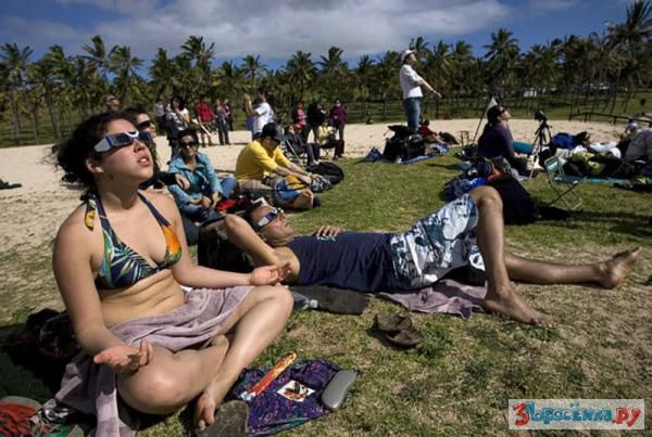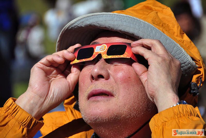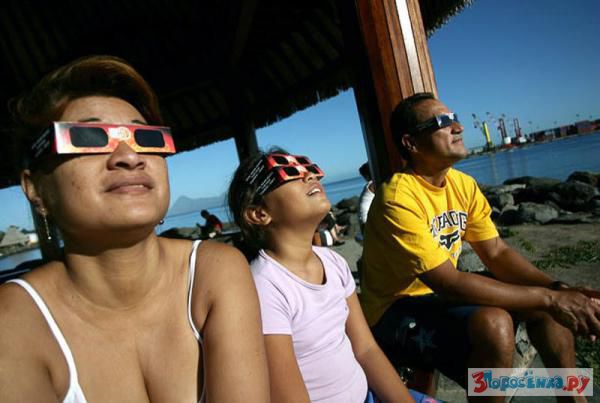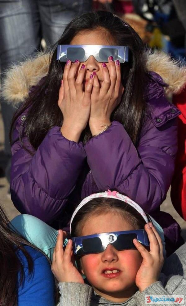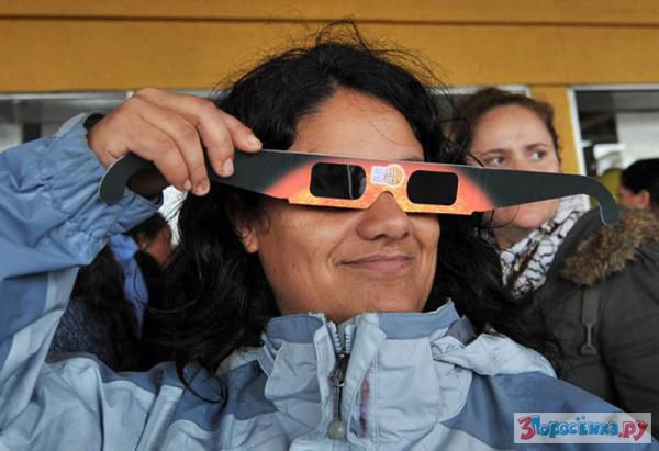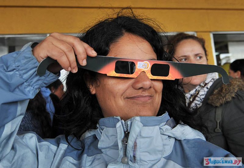 Девочки в очках смотрят солнечное затмение в Кокимбо, приблизительно в 450 км к северо-западу от Сантьяго. Ученые утверждают, что во время наблюдения за солнечным затмением необходимо иметь какую-то защиту для глаз.