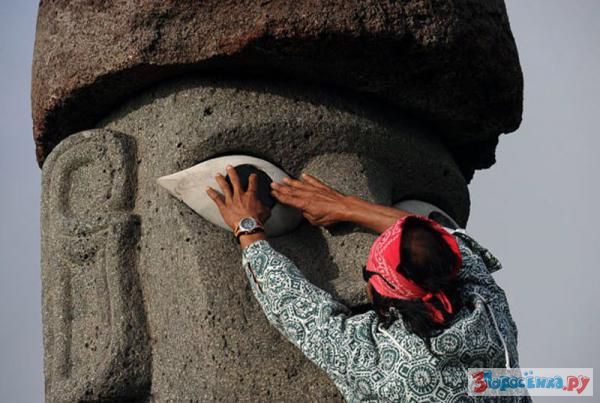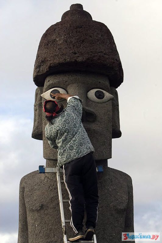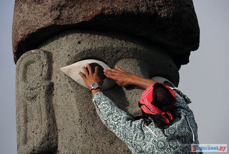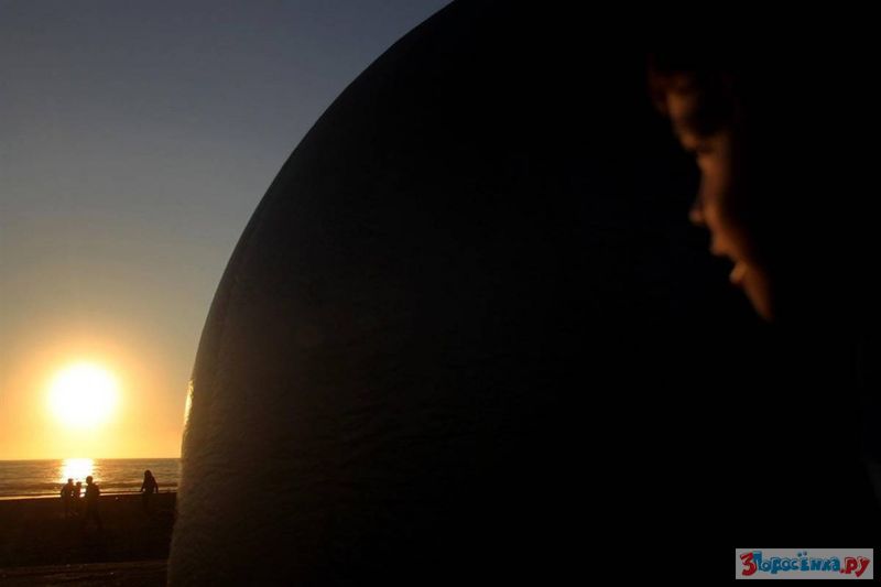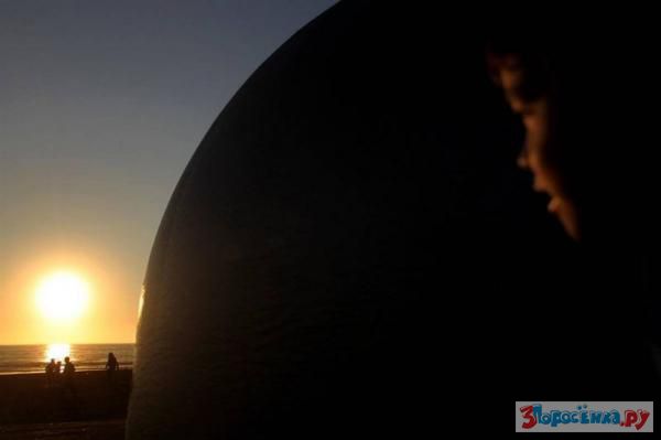 Девушка использует кусок рентгеновской пленки, чтобы прикрыть глаза по время полного солнечного затмения в Вальпараисо. За ней светится статуя, подражающая знаменитым статуям на острове Пасхи.