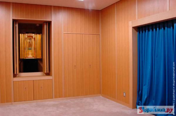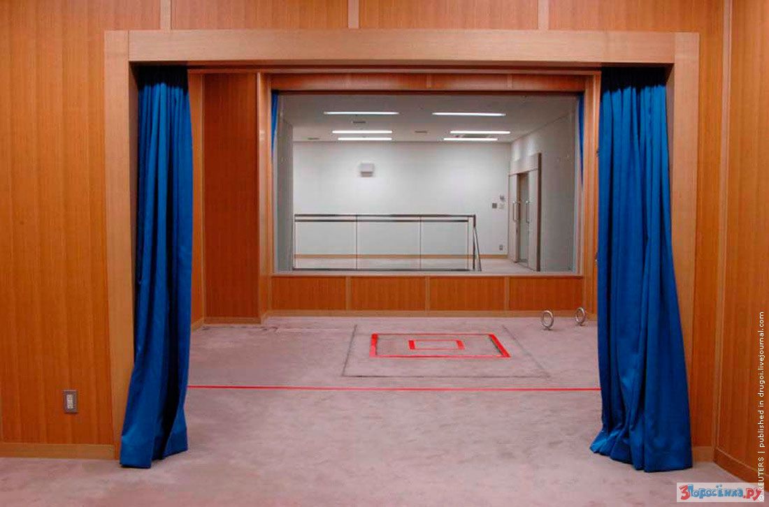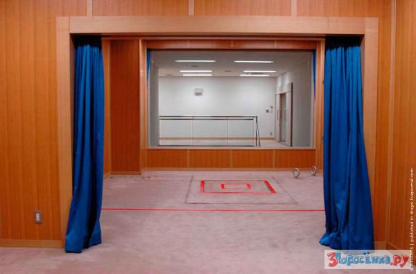 На снимке: комната с фигурой Будды в нише, за занавесом - помещение для казни. В Японии преступников вешают.