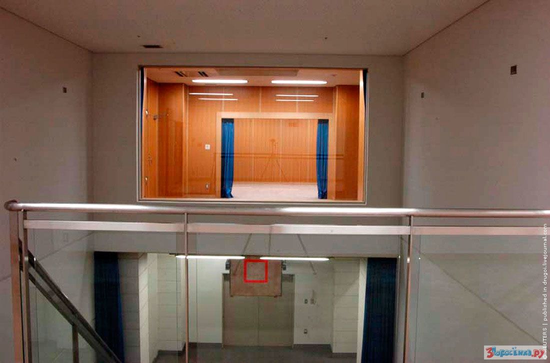 Помещение для казни с другой стороны. Наблюдающие за казнью, после того, как люк опускается и человек проваливается в него на веревке, спускаются на нижний этаж, чтобы зафиксировать смерть приговоренного.