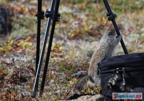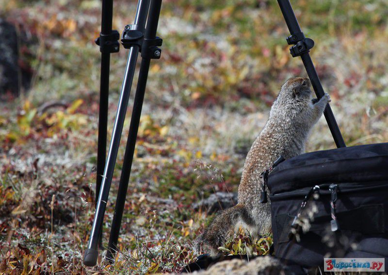 Пока ребят не было, я снимал один, а вокруг меня буквально скакало стадо голодных и наглых евражек, один из которых даже попробовал на зуб один из штативов.