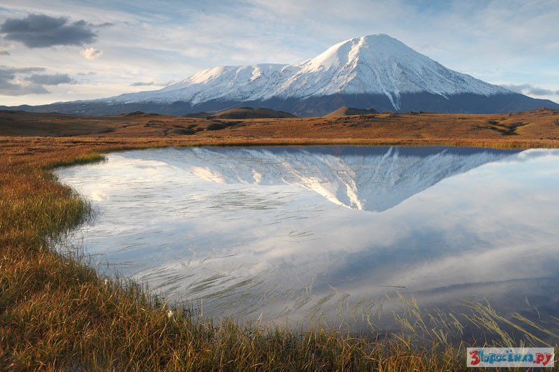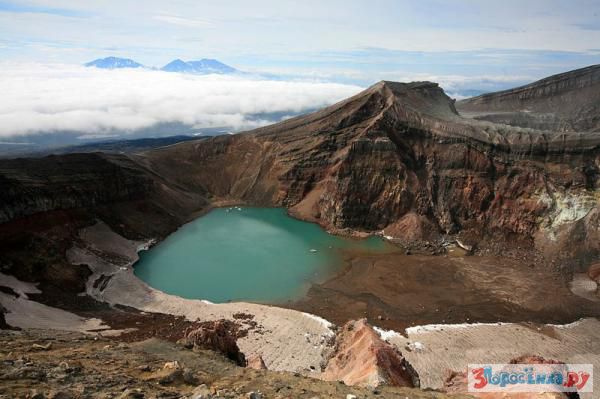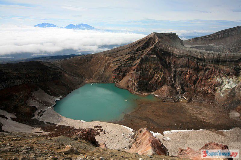 Внизу пресное озеро, а на заднем плане над облаками виднеется вулкан Мутновский.