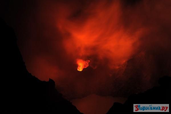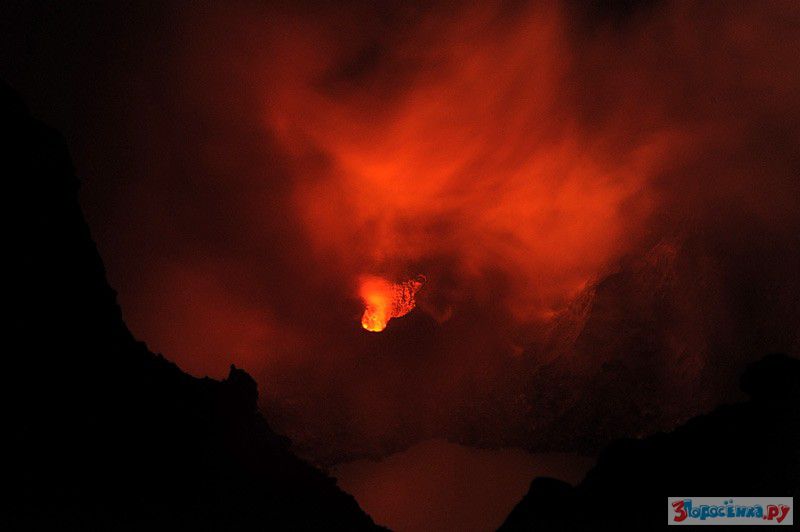 Подъём на этот вулкан в принципе не сложный, и мы не спешили (вся ночь впереди), и где то через два часа оказались на краю кратера (их там два) с пресным озером. К этому времени уже была ночь, и со стороны кислотного озера можно было рассмотреть багровое свечение. Ветер постоянно сдувал кислотные испарения в сторону. Оценив ситуацию, мы решили попробовать пройти к кратеру с кислотным озером и посмотреть на то что там происходит с другой стороны...