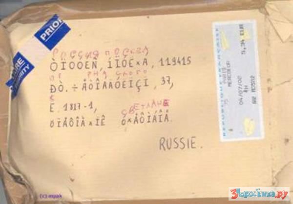 Милая девушка заказала знакомому французу книжку (Гарри Поттера на французском, обычную, бумажную. Домашний адрес легкомысленно написала по-русски и отослала электропочтой. Невозмутимый француз нисколько не удивился тому, что эти русские пишут сплошь гласными буквами со всевозможными комбинациями точечек, штрихов и крышечек, внимательно перерисовал их все на картон, оформил посылку на почте (ни один почтальон не удивился загадочному русскому языку!!) и отправил в Россию. К счастью, догадался приписать сбоку слово RUSSIE. Вы когда-нибудь видели почтовую бандероль, где адрес написан явно в неправильной кодировке? Шариковой ручкой, по картону, в графе "Адресат" все эти буквочки с крышечками, точечками и штрихами в обе стороны... ...незабываемое зрелище. Но посылка дошла, причем быстро. По индексу можно определить страну, город и улицу (почтовое отделение) - слава труженикам почты, не поленившимся это сделать (быть может это был не первый случай в их практике). Как выяснилось позже, дотошными людьми, которые перевели написанное в более понятную кодировку, адресат находился на проспекте Вернадского.